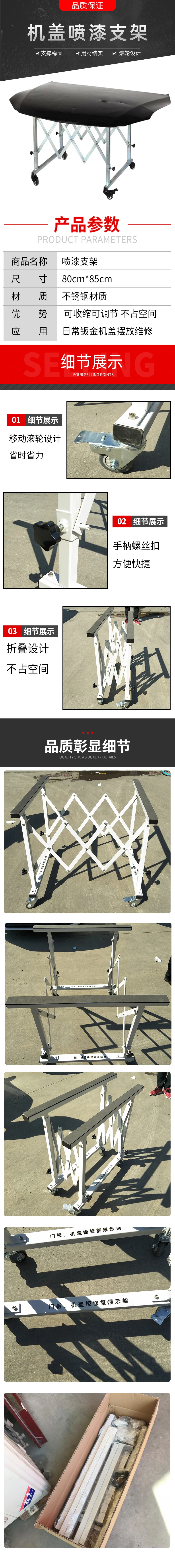 The packaging size is 85*28*10cm. The net weight is 16KG and the gross weight is 18KG. Convenient for daily sheet metal door panel placement, movement, maintenance and painting. It can be adjusted in height, can be contracted, and does not take up space.
