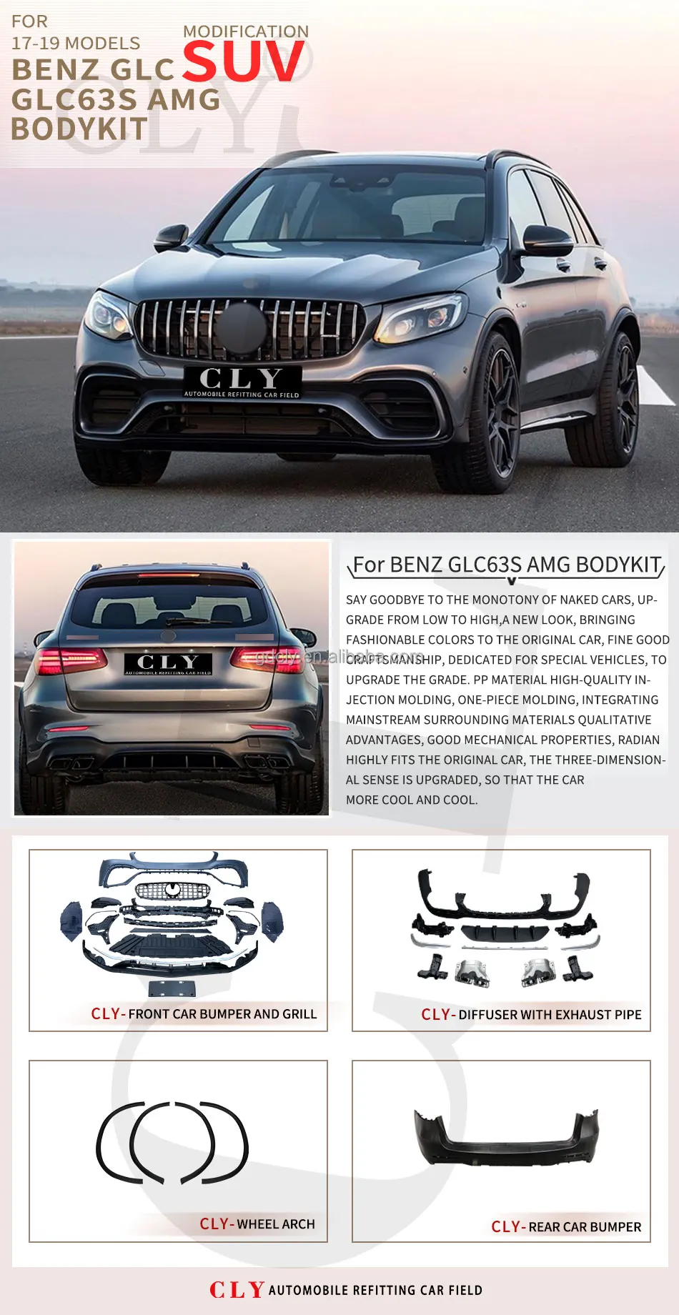 CLY Body kits For Mercedes 16-19 GLC X253 GLC300 GLC260 SUV Upgrade GLC63 AMG Car Bumpers Grill Lining Wheel Arch Diffuser Pipe