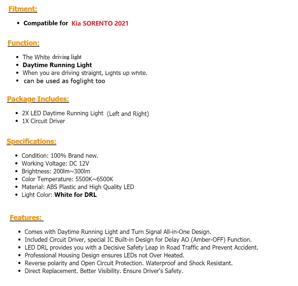 WINAUTO Car Front Bumper Driving Light Foglight Fog lamp DRL For Kia Sorento 2021 LED Daytime running light